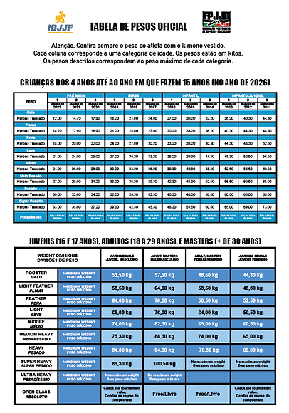 • Este evento rege-se pela tabela de peso oficial da IBJJF para eventos com Kimono. Atenção: Pede-se a todos os atletas, professores e encarregados de educação que tenham especial atenção na inscrição das categorias do campeonato Kids. Confirmem se o peso em que fizeram a inscrição corresponde ao da idade do atleta. Os pesos oficiais encontram-se nas tabelas ao lado.